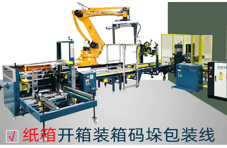 北京纸箱开箱装箱封箱称重贴标打包捆扎码垛缠膜包装线