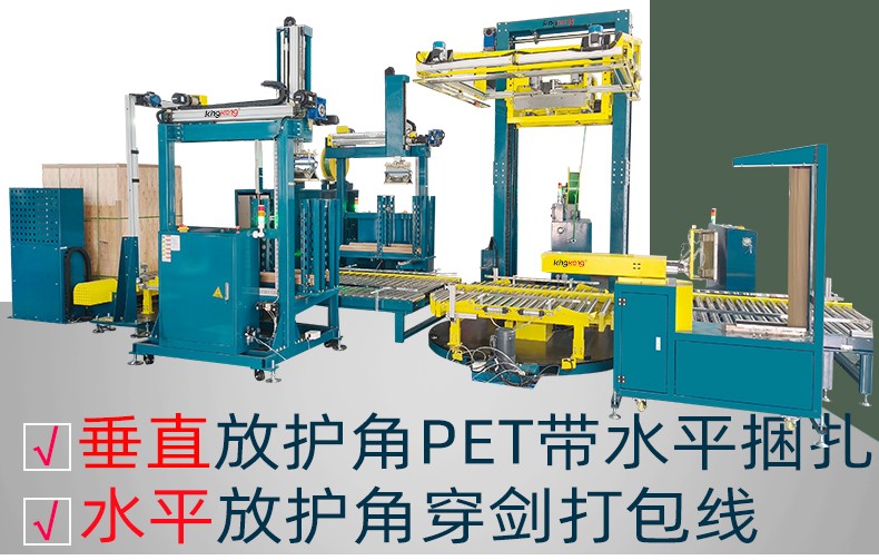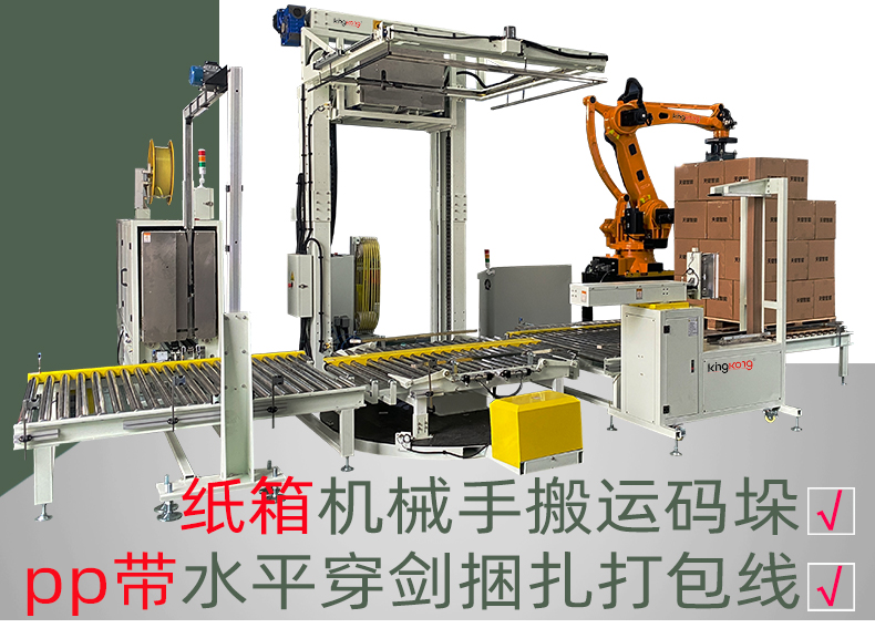 北京托盘PET带穿剑水平捆扎覆顶缠膜包装线